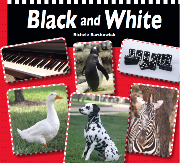 “Dominoes are black with painted white dots. A Dalmatian is white with furry black spots.” Using beautiful photography, this board book uses rhyming text to make comparisons between black and white objects. (12 pages)