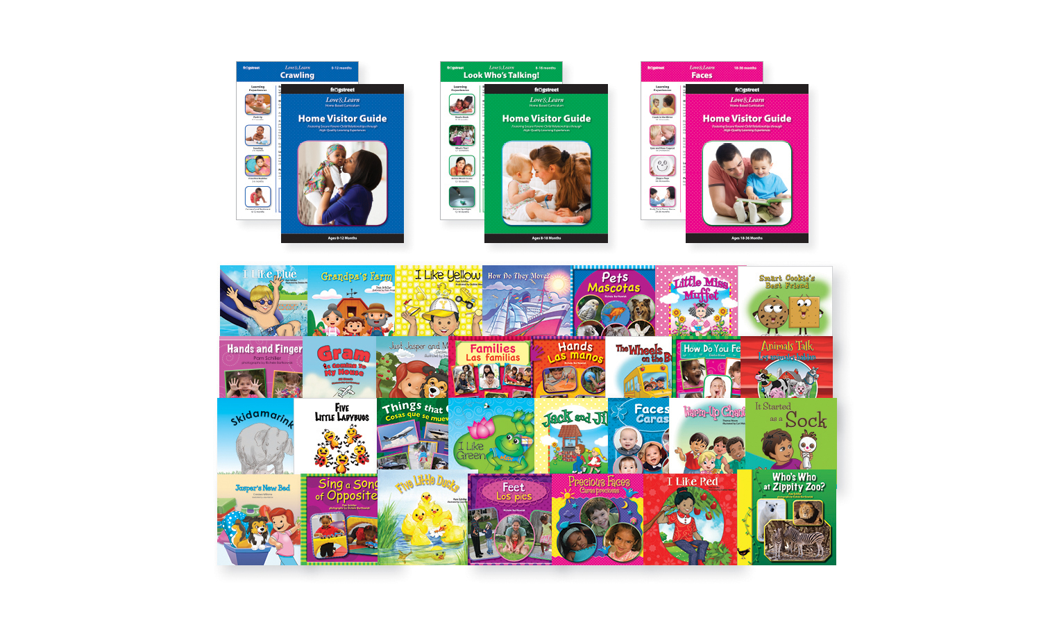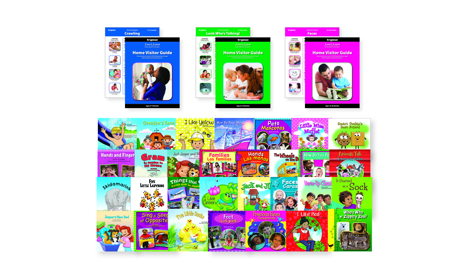 – Home Visitor Guides (Each guide contains 50 weekly lesson plans for an entire year. Three guides: ages 0-12 months, 8-18 months, 18-36 months)
