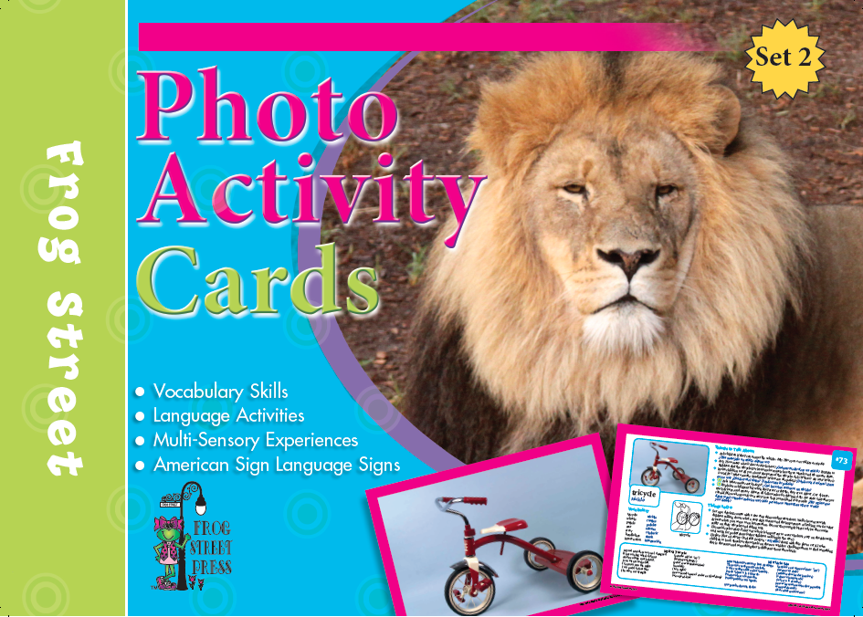 Full-color 9” x 12” cards with a photo on the front and activities on the back. Information on the back includes vocabulary in English, Spanish, and American Sign Language; discussion prompts; and activities that support the photograph.